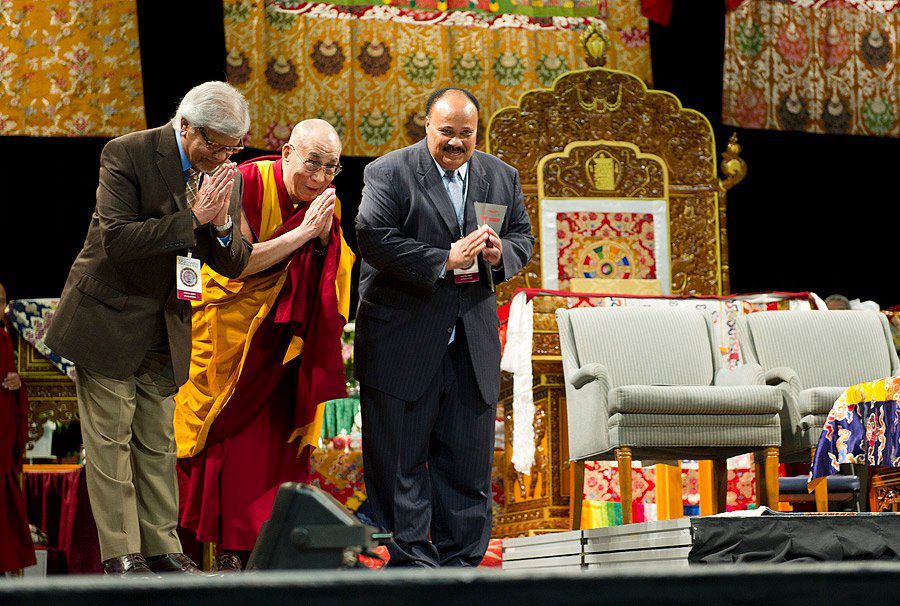 His Holiness the Dalai Lama with special guests Arun Gandhi (grandson of Mahatma Gandhi) and Martin Luther King III (son of Martin Luther King Jr) during celebrations in honor of His Holiness’s 76th birthday held in Washington DC, USA, on July 6, 2011.
